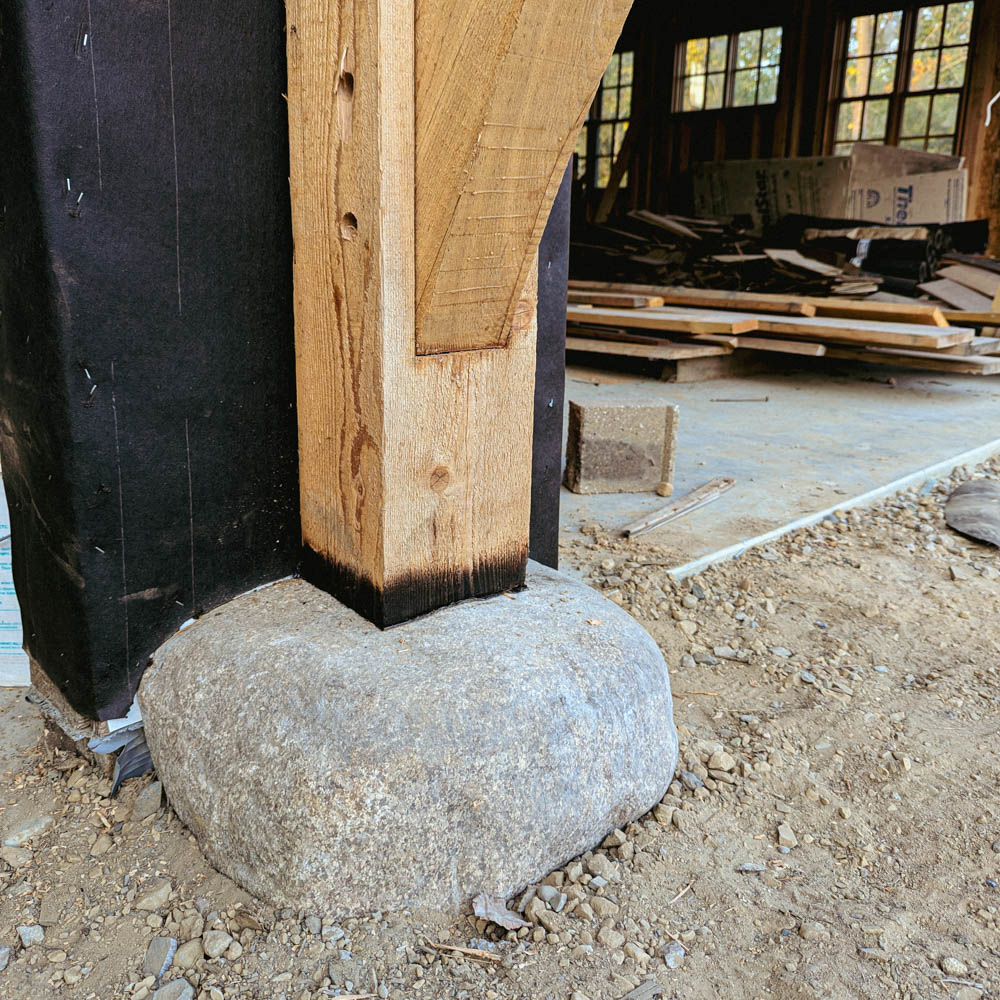 This White Oak timber frame porch features heavy-duty posts meticulously hand-scribed to a natural rock foundation. Topped with a character-rich rusty metal roof, the design blends the refined strength of traditional oak joinery with a rugged, organic aesthetic.