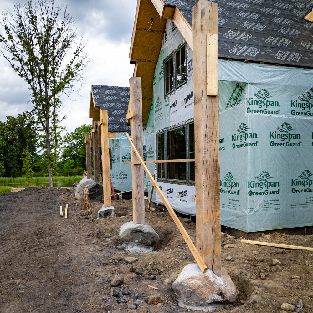 Form, function and craftsmanship combine to create a fabulous entry. Crafted completely from Michigan white cedar, this timber framed porch roof uses very few fasteners. Instead it relies joinery and design. The posts are 6”x6” with plates and tie beams. The rafters, made from 4”x6” timbers with braces and girts, use a joint that gets tighter with more weight. Look up and find the tongue and groove ceiling as appealing as the straight on view. This is a great example of how going old school can give a whole new look (and life) to an exterior.
